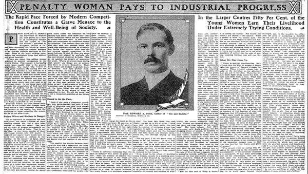 Professor Edward A. Ross, author of Sin and Society, spoke out in the New York Times on May 3, 1908. In an article titled “The Price Woman Pays to Industrial Progress,” Ross warned that America’s “fine feminine form” was endangered by commercial society.