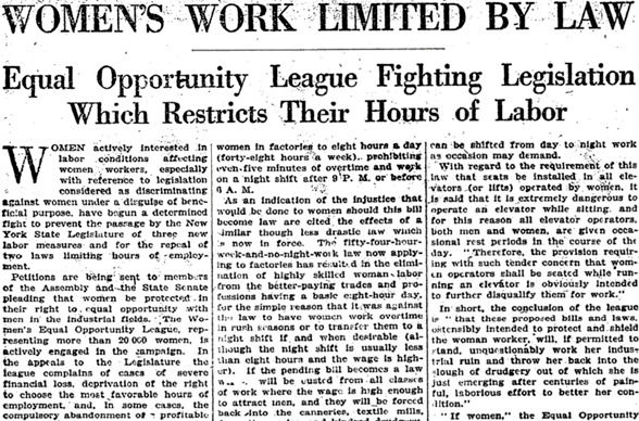 In short, the conclusion of the League is that these proposed bills and laws, ostensibly intended to protect and shield the woman worker, will, if permitted to stand, unquestionably work her industrial ruin and throw her back into the slough of drudgery out of which she is just emerging after centuries of painful, laborious effort to better her condition. (“Women’s Work Limited by Law,” New York Times, January 18, 1920)